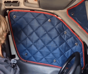 Schritt 4: Nimm die BlidimaX® für die Seitenscheibe zur Hand. Setze sie zuerst auf die untere Fensterkante auf. Positioniere sie so, dass sie die Scheibe nach vorn und hinten komplett abdeckt.