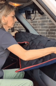 Schritt 1: Ziehe dein Set aus dem Packsack. Lege die Matte für die Frontscheibe ausgerollt und mit den Saugnäpfen nach oben auf das Armaturenbrett. So hast du sie griffbereit und sie kann sich kurz „entspannen“.